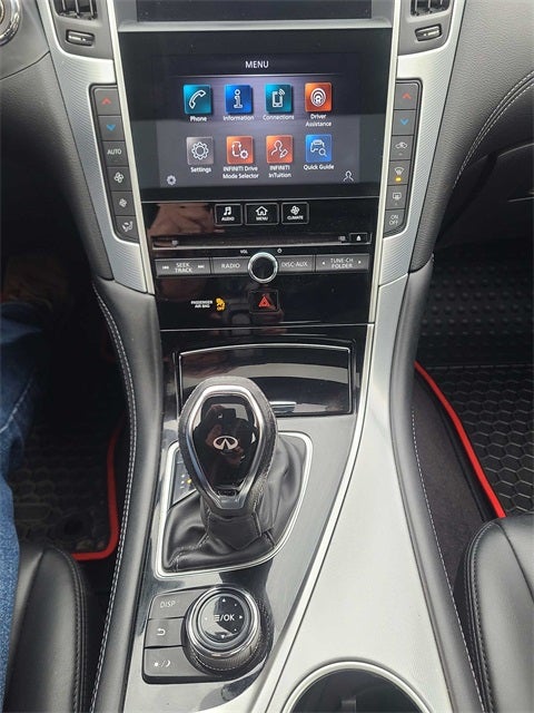 - Radio: INFINITI InTouch w/AM/FM/HD/CD -inc: dual HD display system w/upper 8" and lower 7" WXGA touchscreen displays, Apple CarPlay and Android Auto, streaming audio via Bluetooth®, Bluetooth® hands-free phone system w/text messaging assistant, voice recognition for audio, Bluetooth® and vehicle information including music search by voice, SiriusXM radio w/3-month complimentary trial, 6-speaker audio system, 2 illuminated USB connection ports (1 type A and 1 type C) for iPod interface and other compatible devices, 2 12-volt accessory power outlets and auxiliary audio input